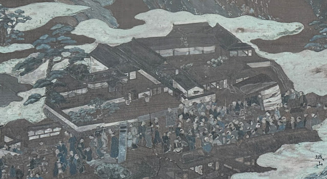 これが案内版にあった当時の花岡宿の茶屋の様子ですが、物凄い大勢の人々で賑わっています。たしかに左手に槙柏(シンパク)の大樹がありますね。ここは花岡宿の宿場やお茶屋があっただけでなく勘場という村の役所もあったそうなのでこれだけの人々が集まっているのでしょう。